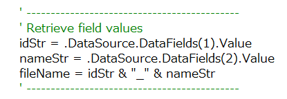 - 中盤の以下の記載部分にて、出力するファイル名を指定する。 以下の例では、差し込み印刷の1列目がID、2列目が氏名が入っている想定です。 この時、123456_山田 太郎.pdf という名称で出力されます。 仮に差し込み印刷3列目を使いたいのであれば、DataFields(3)と変更すれば利用可能です。