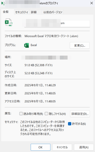 3.プロパティの画面下部にある、セキュリティ>許可するにチェックし、適用→OKをクリックする